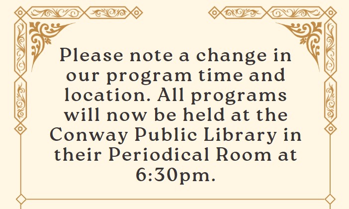 If anyone has an idea for an upcoming program that would be of interest to you, or if you know of someone who would be willing to present a program, please contact Heather Corrigan at hcorrigan.conwayhistorical@gmail.com